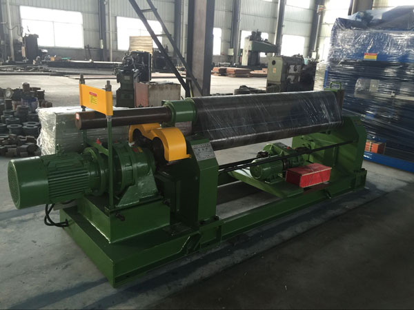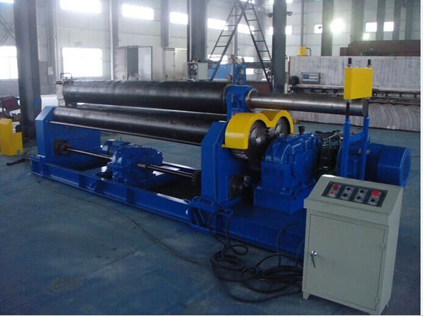 該機(jī)結(jié)構(gòu)形式為三輥對(duì)稱(chēng)式,上輥在兩下輥中央對(duì)稱(chēng)位置作垂直升降運(yùn)動(dòng),通過(guò)絲桿螺母蝸桿轉(zhuǎn)動(dòng)而獲得,兩下輥?zhàn)餍D(zhuǎn)運(yùn)動(dòng),通過(guò)減速機(jī)的輸出齒輪與下輥齒輪齒合,為卷制板材提供扭矩。該機(jī)缺點(diǎn)是板材端部需借助其它設(shè)備進(jìn)行預(yù)彎。